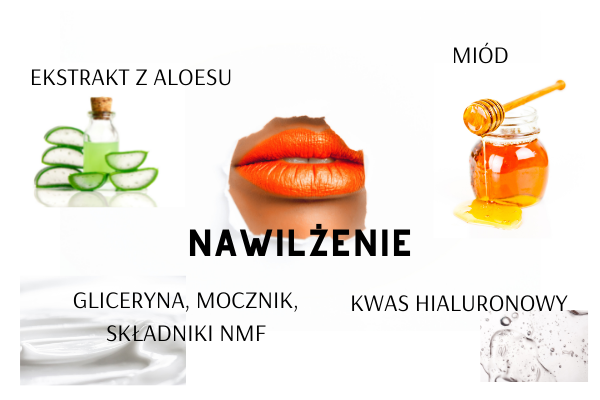 Substancje nawilżające są bardzo istotne, ponieważ wygładzają i zmiękczają naskórek. Związki o charakterze emolientów tworzą ochronną warstwę na powierzchni ust, dzięki czemu zmniejsza się transepidermalna ucieczka wody.