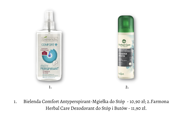 Ostatnią grupą produktów, o których chcielibyśmy wspomnieć są kosmetyki niwelujące nieprzyjemne zapachy oraz ograniczające produkcję potu. Wszelkiego rodzaju dezodoranty i antyperspiranty do stóp mogą być wybawieniem w trakcie upalnych dni, gdy nie mamy wyjścia i musimy założyć pełne obuwie.