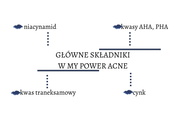 “To innowacyjna fuzja przeciwtrądzikowej mocy bioaktywnych molekuł: niacynamidu, cynku oraz kwasów AHA, które synchronicznie dbają o zdrowy wygląd młodej cery, skupiając się na walce z trądzikiem i zaskórnikami.” Tak właśnie brzmi główny opis produktów z serii my power acne. Nawiązuje on do głównych składników aktywnych, które znajdziemy w praktycznie każdym z produktów. Jakie jest ich działanie? Przyjrzyjmy się im bliżej.