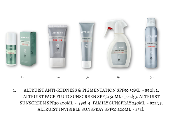 Marka Altruist to przede wszystkim bogata oferta produktów SPF zarówno do ciała jak i do twarzy. Opiszemy Wam pokrótce wszystkie kosmetyki, które dostaniecie w naszym sklepie.