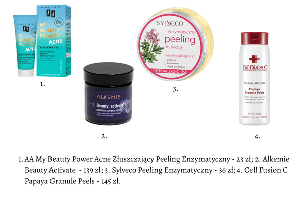 • AA My Beauty Power Acne Złuszczający Peeling Enzymatyczny: enzymatyczny peeling oparty na działaniu papainy. Dodatkowo wyciąg z aceroli, niacynami i cynk sprawiają, że jest to świetny produkt dla cer trądzikowych.