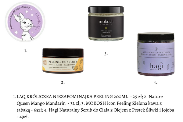 • LaQ Króliczka Niezapominajka Peeling: połączenie lekkiego musu z peelingiem jako alternatywa dla żelu pod prysznic. Dodatek licznych składników aktywnych (masło shea, gliceryna roślinna, nawilżające ekstrakty z lnu, płatków owsianych, mleka ryżowego, ekstrakty z zielonej kawy, cynamonu, imbiru i papryki) sprawiają, że skóra nie jest przesuszona, a przyjemnie wypielęgnowana.