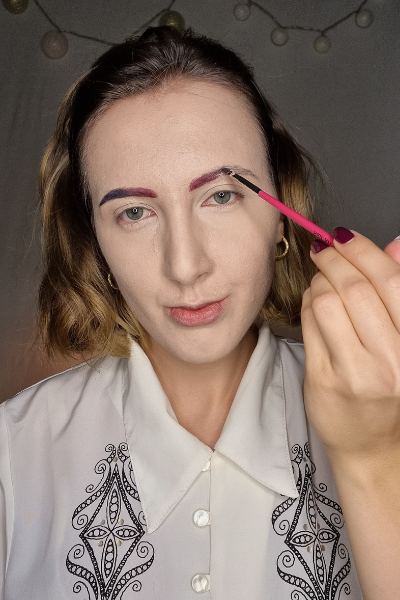 W następnej kolejności zabieramy się na podkreślenie brwi. Jest to kwestia bardzo indywidualna. Jeśli lubisz wyczesane, “nastroszone” lub bardzo dokładnie podkreślone - śmiało możesz takie wykonać. Agnieszka zdecydowała się na cieńszy obrys, aby jeszcze lepiej odwzorować postać. W tym celu zastosowała bardzo ciemny, czerwono-burgundowy cień.