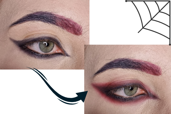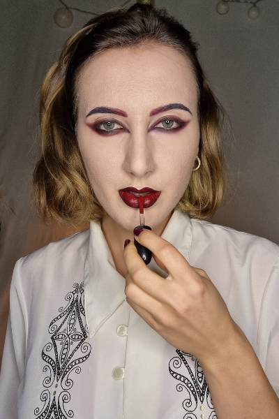 I tak naprawdę w tym miejscu można zakończyć makijaż, ewentualnie dodać lekką “strużkę krwi” w kąciku ust - makijaż inspirowany wampirami gotowy! Jednak my idziemy dalej. Czas na dopracowanie charakteryzacji! Do narysowania linii i kropki wykorzystujemy te same produkty jak dotychczas. Staramy się by linie były ostre i wyraźne. I tu, po raz kolejny, bardzo przydatne okazują się precyzyjne pędzelki.