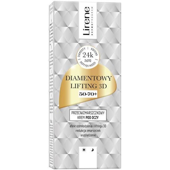 Przeciwzmarszczkowy krem pod oczy, który wygładza i poprawia elastyczność skóry 50 - 70+. Stosowanie kremu zniweluje cienie i „worki” pod oczami. Doskonale redukuje zmarszczki, zwiększa jędrność i napięcie oraz regeneruje skórę - Lirene Diamentowy Lifting 3D.