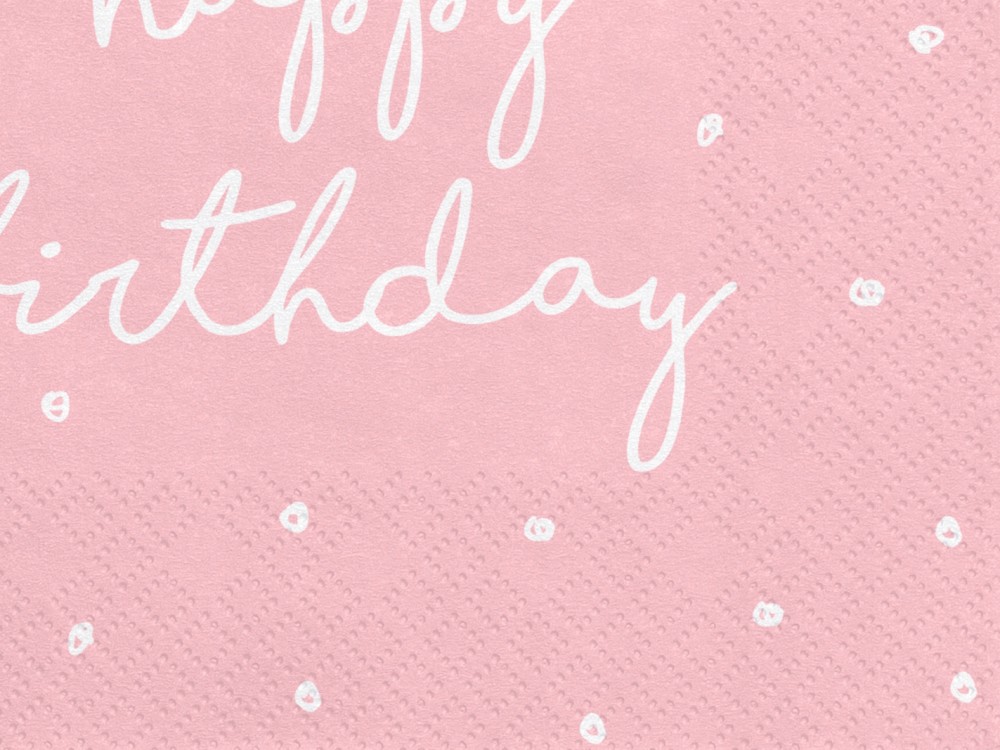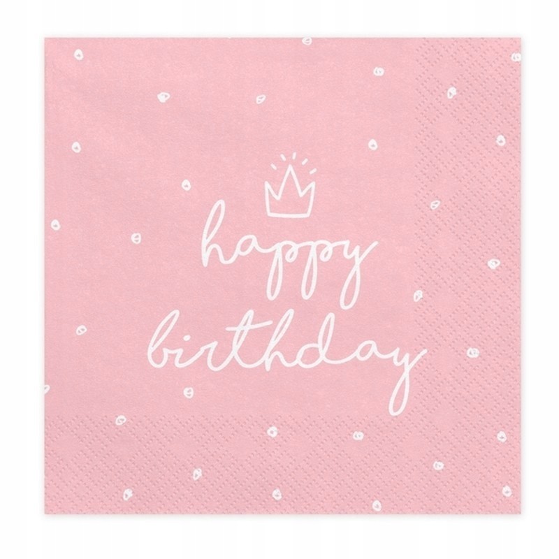 Prześliczne serwetki z białym napisem "Happy birthday", na uroczym różowym tle, będą idealnie prezentowały się na urodzinowym stole. Serwetki są bardzo praktyczne, oraz sprawią, ze Wasze stoły będą prezentować się jeszcze piękniej. Wszyscy goście z pewnością będą zachwyceni taką dekoracją, a na twarzach Waszych pociech na pewno pojawi się uśmiech i zadowolenie.
