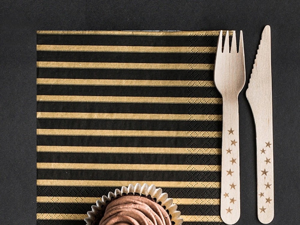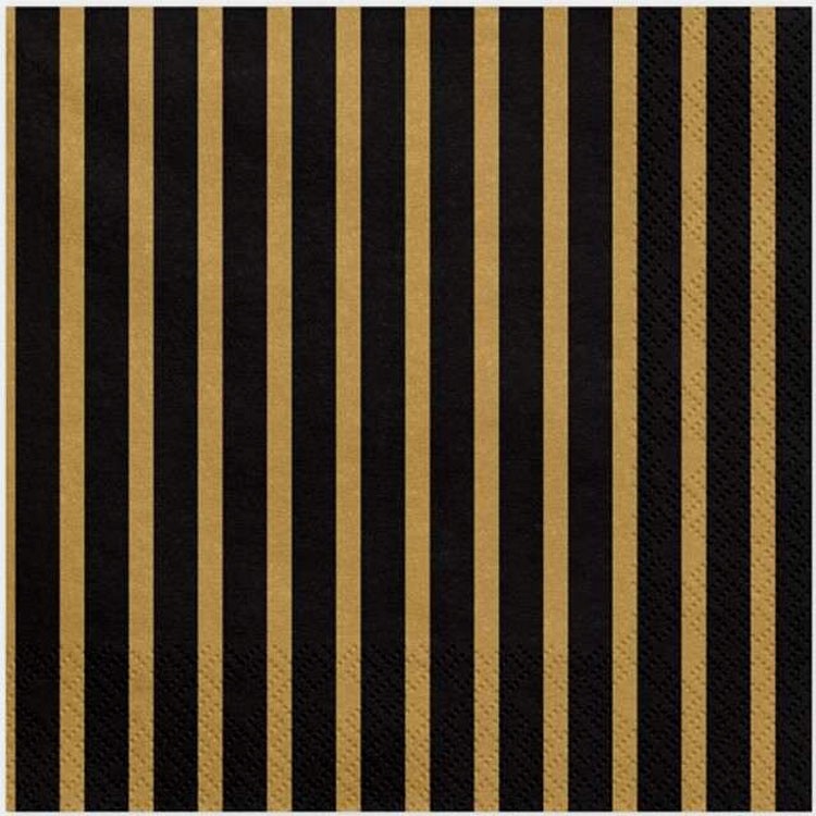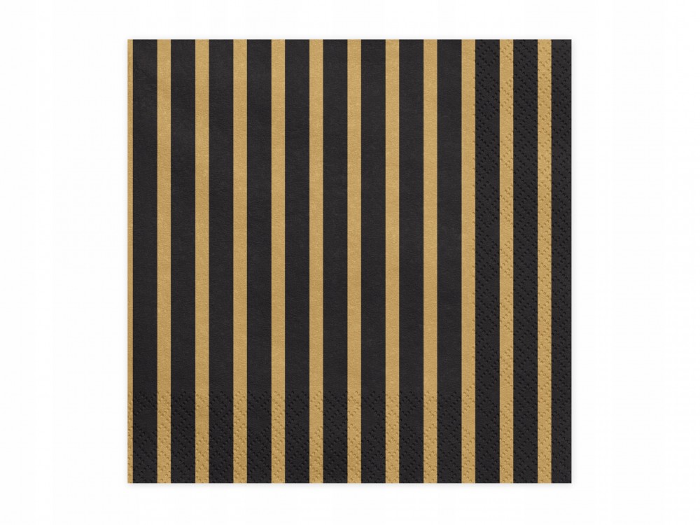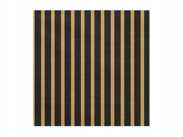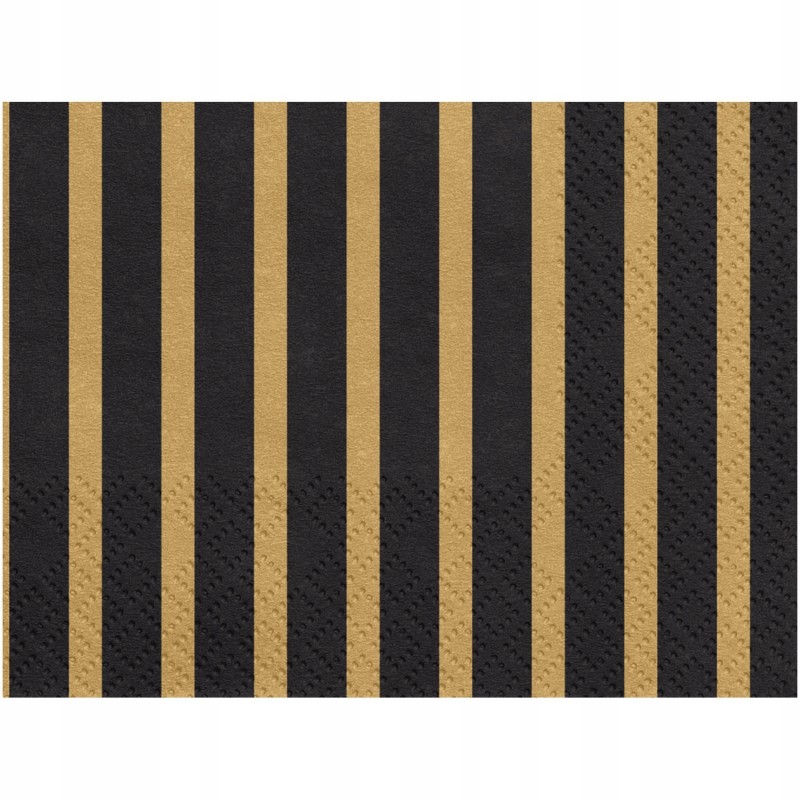 Serwetki papierowe w kolorze czarnym ze złotymi paskami, wymiary po rozłożeniu ok. 33 x 33 cm, wymiary po złożeniu ok. 16,5 x 16,5 cm. 1 opakowanie zawiera 20 szt.