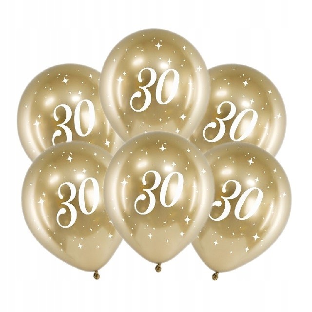 Zestaw sześciu efektownych, połyskliwych balonów w kolorze złotym z efektownym nadrukiem w postaci liczby 30. Doskonały element dekoracyjny na każdą rocznicę czy imprezę urodzinową. Dzięki powłoce typu Glossy wyjątkowo błyszczą i będą wspaniale wyglądać na każdym przyjęciu.
