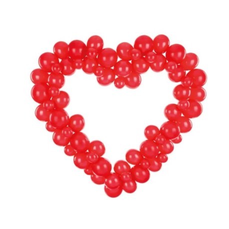 Czerwona girlanda balonowa ze stelażem Serce, zestaw zawiera 68 balonów lateksowych w kolorze Pastel Poppy Red, 16 kartonowych elementów, 20 szt. naklejek dwustronnych, instrukcję. Wymiary po złożeniu ok 166 x 160 cm.